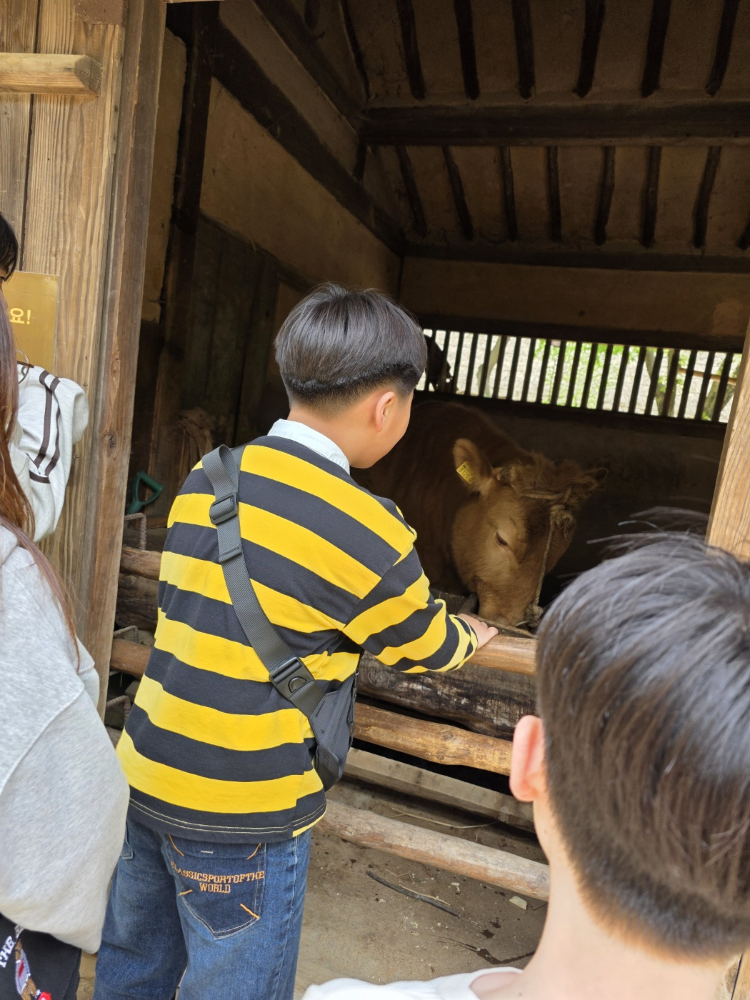 입장하자마자 전통 가옥들을 둘러보다 처음으로 ‘소’를 본 아이들은 무척 신기해했어요.