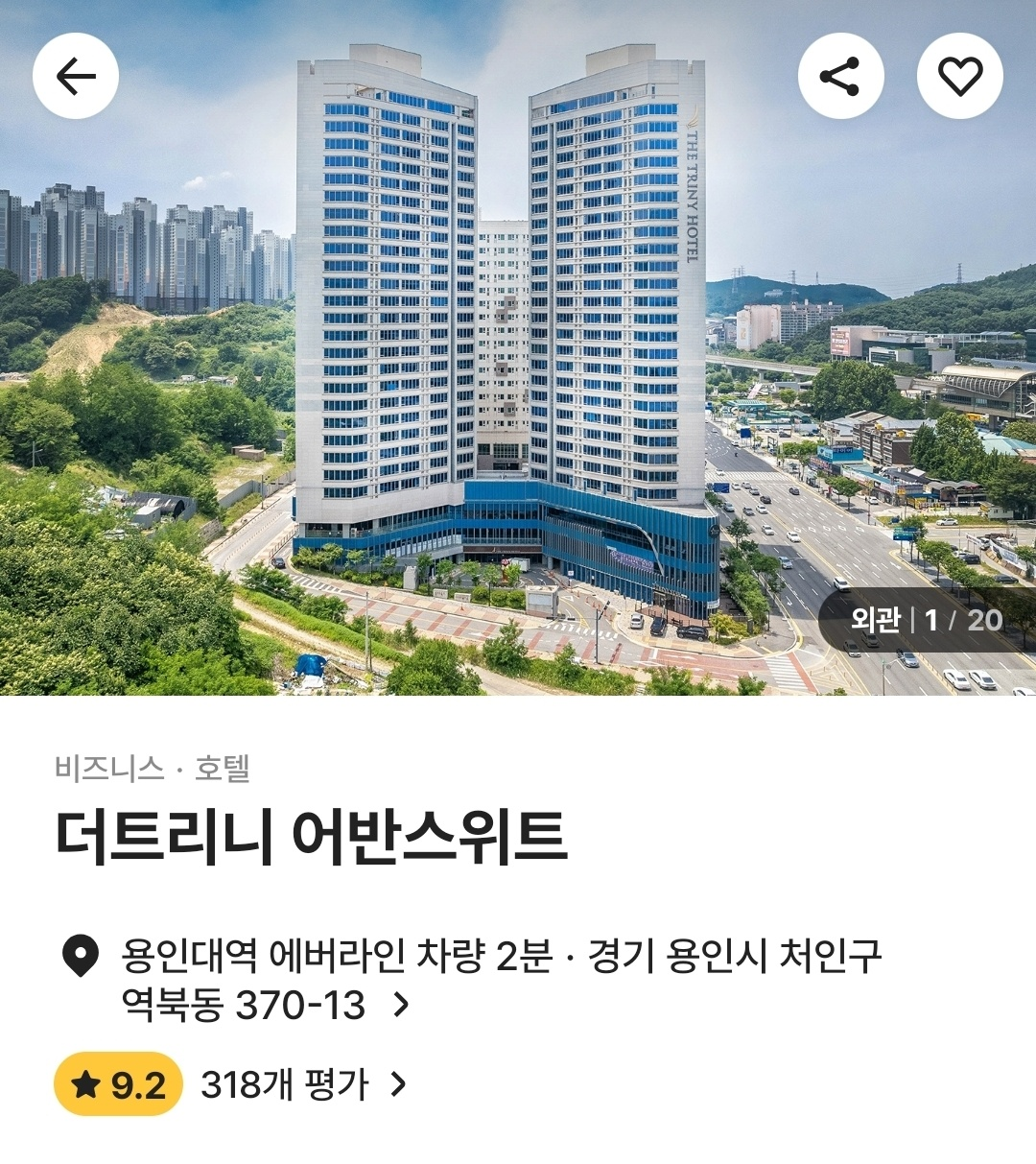 놀다 보니 어느덧 저녁, **‘여기어때’ 앱으로 예약한 ‘더 트리니 어반 스위트’**에 도착했습니다.