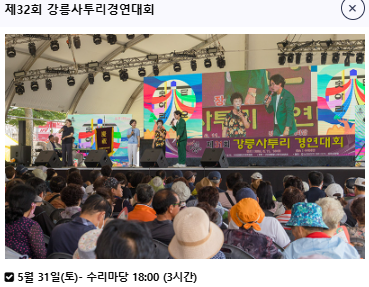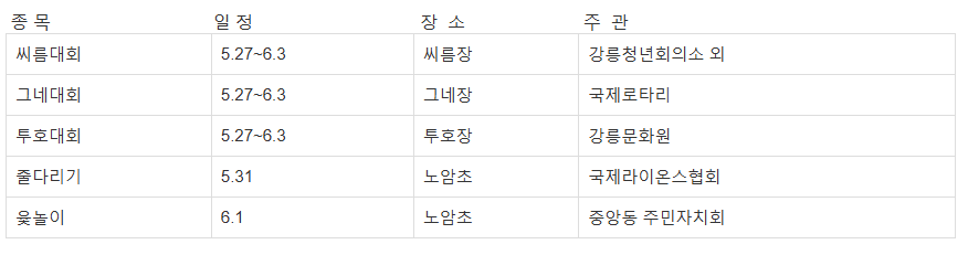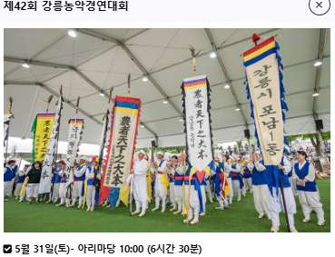 | 강릉농악경연 | 5.31(토) 10:00 | 아리마당 |