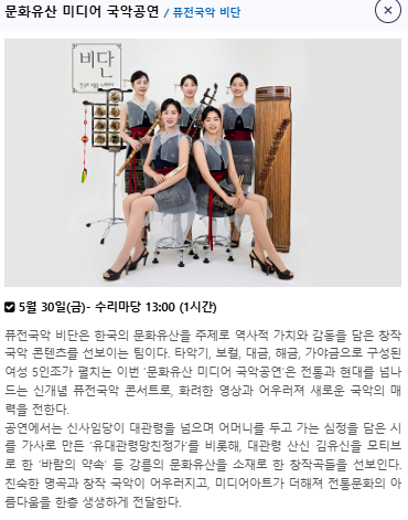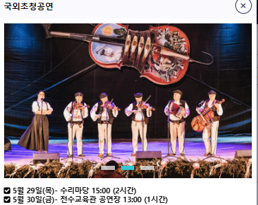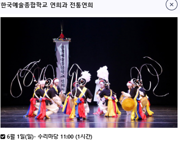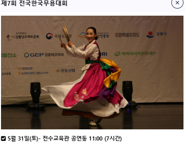 | 한국무용대회 | 5.31(토) 11:00 | 전수교육관 |
