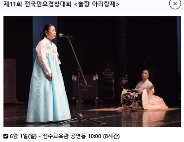 | 전국민요경창대회 | 6.1(일) 10:00 | 전수교육관 |