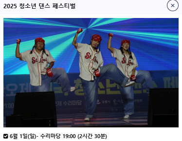 | 댄스페스티벌 | 6.1 19:00 | 수리마당 |